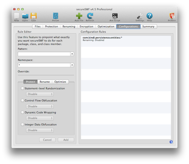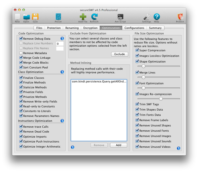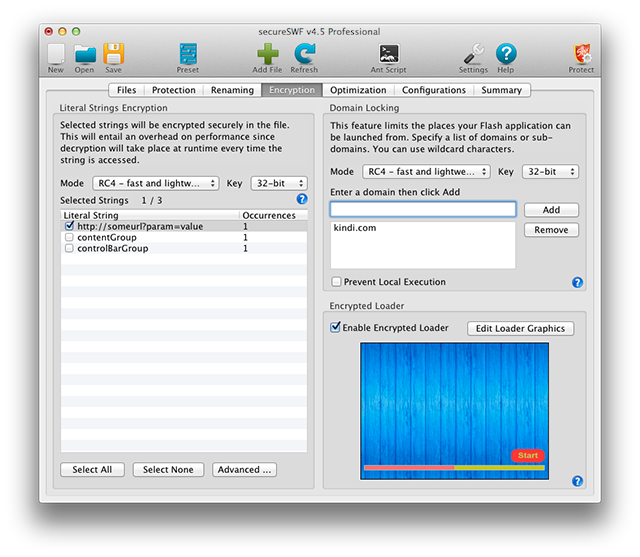 Will protect file.swf and save it as protected.swf using the safe preset. It will also encrypt the string "http://url/" and lock the file to kindi.com. secureSWF will also set control flow obfuscation on using 100% intensity, remove trace calls, and enable Merge lines with 50% intensity.