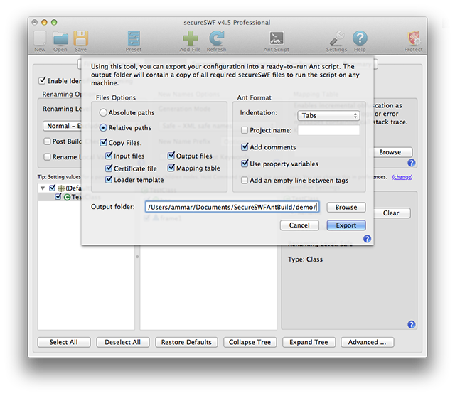 Exporting to CLI simply generates secureSWF.jar file in the selected folder. However, it is important to note that the generated Jar file corresponds to the activated edition of secureSWF. For example, if you are using the Demo version, and have not activated secureSWF, then the Jar file can only be used as a Demo. It cannot be activated later on.