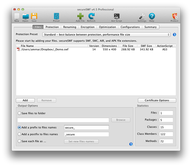 Will protect file.swf and save it as secure_file.swf using the standard preset.
