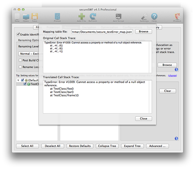 When files are protected with identifiers renaming turned on, error messages with reference to the code will also be obfuscated. Because secureSWF generates a mapping table, you can still translate the code references in these messages.