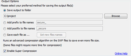 Add prefix to filenames: The protected SWF files will be saved in the same folders they are in but with adding the prefix text that you've entered (default "secure_") at the beginning of the filename.