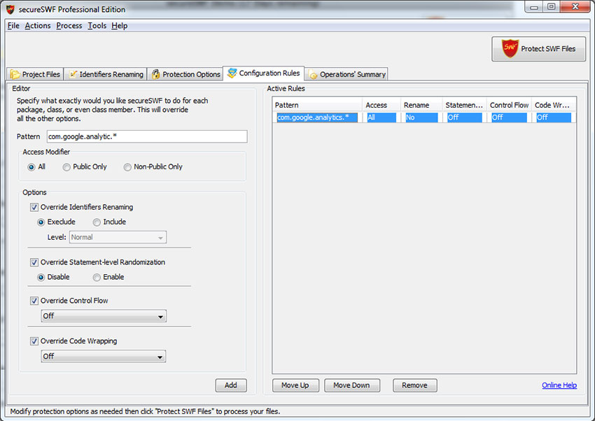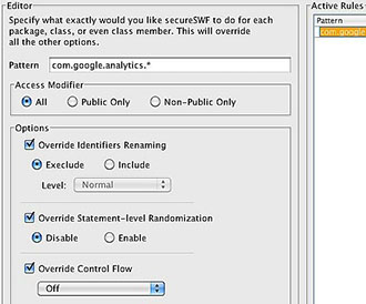 While previous tabs enable you to specify how your code will be obfuscated down to a single function or identifier, we know that pinpointing every single one could be a very time consuming process. Because of this, we've added the Rules tab. Here you can just tell secureSWF what to do with all the code in an entire package, or a single class. Just write in the pattern and check which options you want to override. You can use this, for example, to avoid obfuscating code merged from SWC libraries provided by third-parties. Rules will override all other settings. |