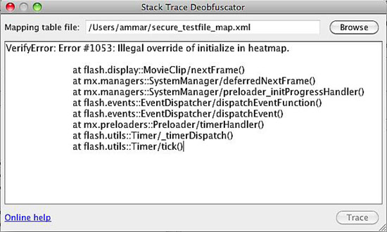 secureSWF is now able to generate a mapping table of the original and new identifiers names. The mapping table is generated using the pattern protectedFileName_map.xml and saved in the same path as the protected file. When this option is enabled, a mapping table is generated for every file. You can use the mapping table in the Stack Trace Deobfuscator tool to translate error message from AS3. Keep the mapping table in a safe place and do not distribute it.
