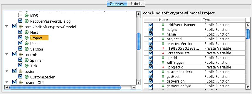 To enable Identifiers Renaming make sure that the Rename Identifiers checkbox is checked. There are 6 tab pages (2 for AS3) in the Identifiers Renaming section: