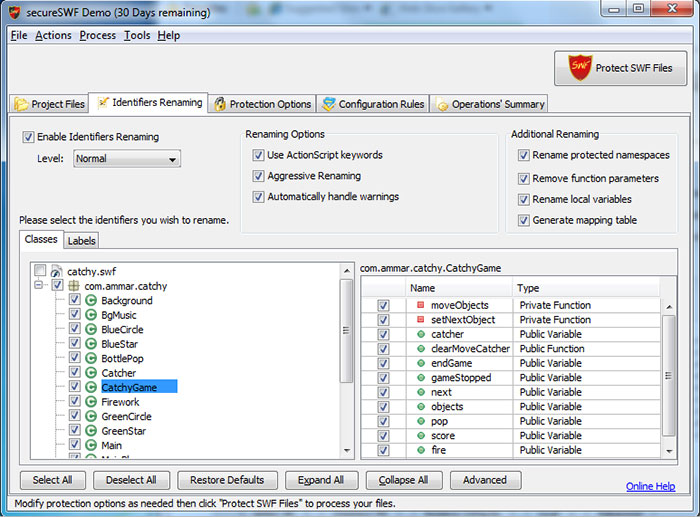 One of the most powerful features of secureSWF is its ability to rename just about every identifier in your SWF file from variables and functions names to frame labels and symbol names in addition to AS3 and AS2 classes. Not only that, but also secureSWF automatically determines the identifiers that are safe to rename and the identifiers that are not. secureSWF has the ability to rename the following identifiers: