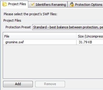 secureSWF is designed to handle either a single SWF file or multiple SWF files that interact together. The Project Files section allows you to add the SWF file(s) that you wish to protect. To get started, click on the "Add" button and select the SWF file(s) that you wish to protect. Or, alternatively, drag the SWF file from your file browser into secureSWF.