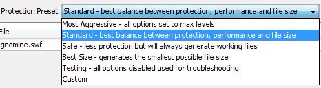 You can avoid digging deeper into the settings by selecting one of the Protection Presets. You can set secureSWF to generate the most aggressively protected SWF files or to generate a smaller SWF file size. The following is a detailed explanation of each preset: