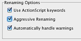 - Enable Identifiers Renaming - Level - Aggressive Renaming - Use ActionScript Keywords - Automatically Handle Warnings Additional Renaming Options |