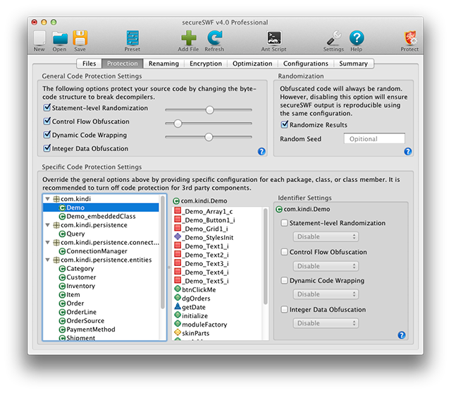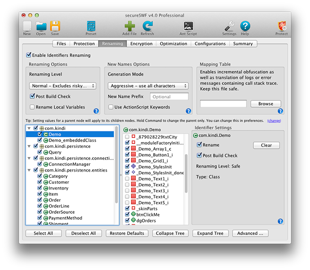 Options in this tab are regarding renaming ActionScript 3 identifiers. This includes packages, classes and class members. secureSWF will ignore SDK classes, which it can recognize, such as Flex and AIR SDKs, as well as helper classes. It will also ignore classes which names' begin with an underscore _ or a dollar sign $.