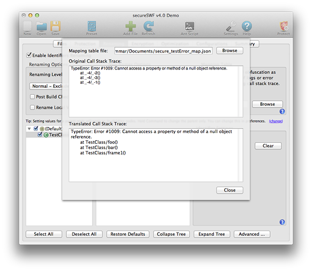When files are protected with identifiers renaming turned on, error messages with reference to the code will also be obfuscated. Because secureSWF generates a mapping table, you can still translate the code references in these messages.