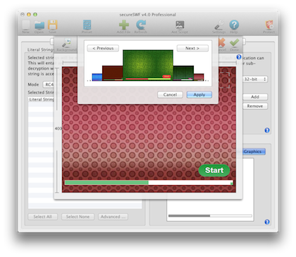 secureSWF's SWF encryption fully encrypts your SWF file, creates a loader SWF using an advanced preloader designer, and places the encrypted SWF file inside the loader to be decrypted securely at run-time.